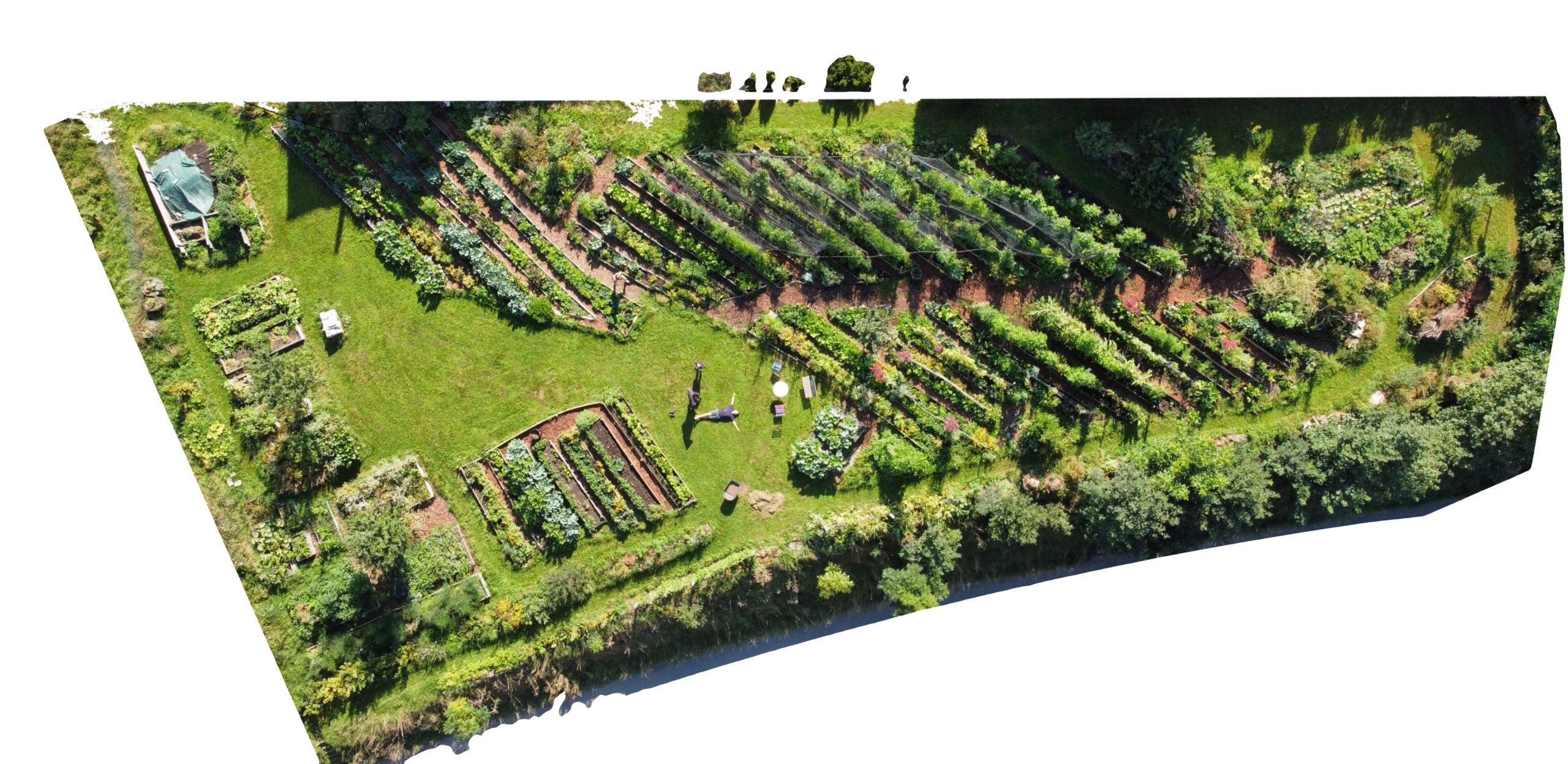 Der Permagarten im Unterdorf liefert rund 40 Ernteteile für die umliegenden Haushalte – frisches Gemüse, Beeren, Obst, Nüsse, Salate, Kräuter und Blumen, alles direkt vom Garten. Er ist biodivers angelegt, mit vielen Nischen für Nützlinge, mit Pflanzgemeinschaften, mit Bevorzugung mehrjähriger und unterschiedlicher alter samenfester Gemüsesorten.